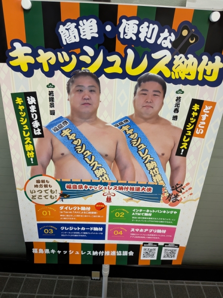 税務署。 2025-11-25 17:22:53 月に一度の火曜日休み、午前中は福島税務署へ。ここに来る時は何故かいつも曇天な空模様な気がします…。入口に郷土力士を使用した税務署のポスター。『決まり手はキャッシュレス納付!』物言いつけるのが十八番な税務署が決まり手を語るのは如何なものかなと。