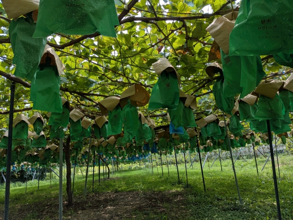 梁川町・葡萄。 2025-08-27 17:47:54 稀な?連休の1日目は朝市場に行き、買ってきた物処理したら梁川町へ(現・伊達市)。親戚が作っているシャインマスカット、ピオーネ畑。食べ頃迄はもう少し先だそうです。